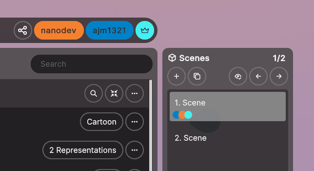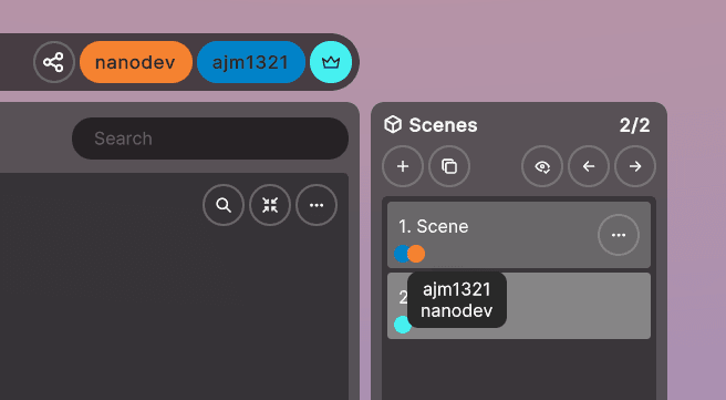 Users can now easily track which scenes other users are in with new color‑coded indicators in the Scene menu. Hovering over a color reveals a full list of users in that scene. To reduce confusion, we’ve also removed 3D cursors for users who are in different scenes than your own.