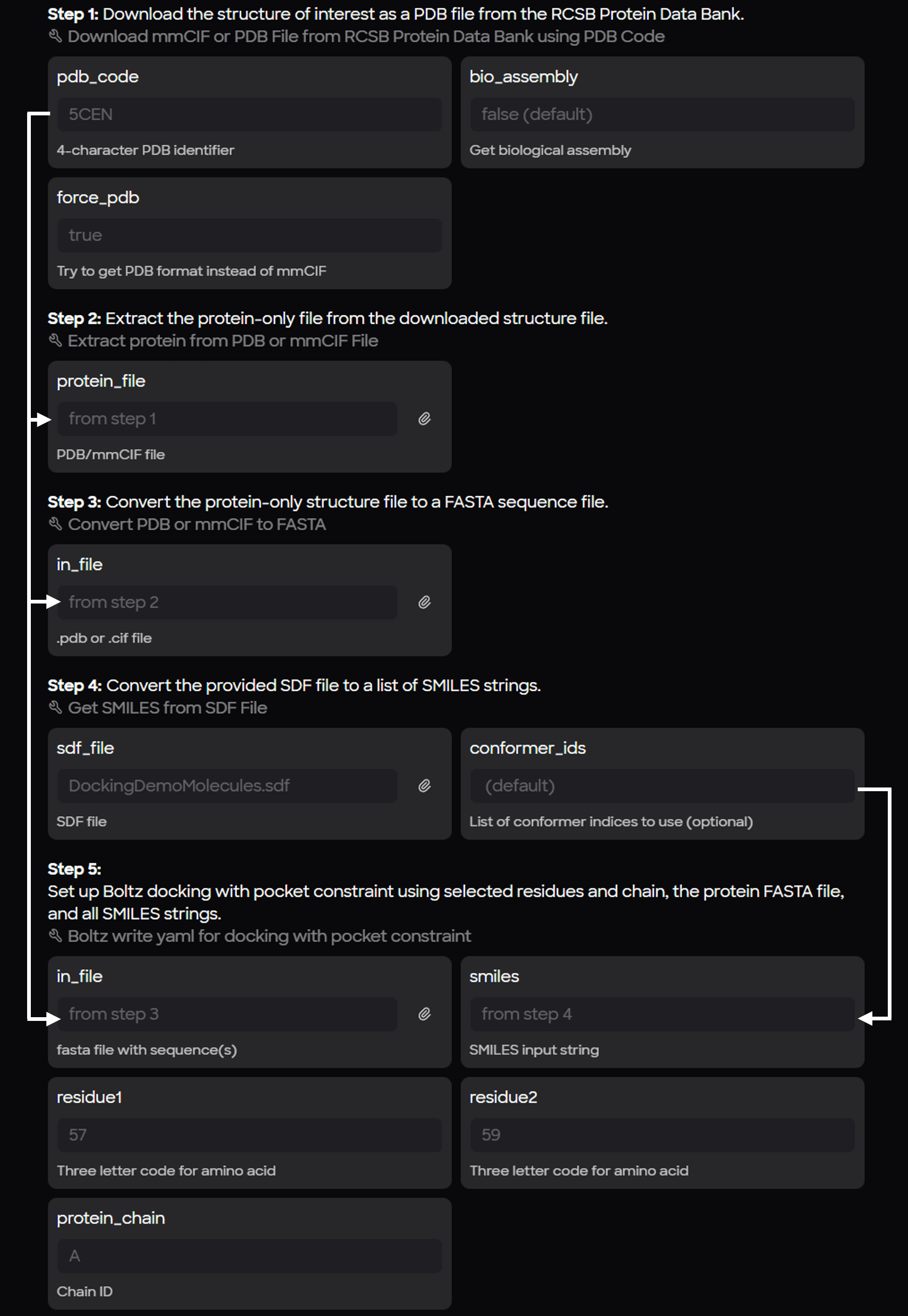 A dedicated workflow (Boltz Docking with Pocket Constraint) was designed to