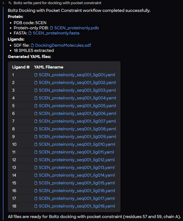 By passing a single protein and an SD file with multiple ligands into MARA, you can instantly generate dozens of YAML files, each ready for computation in Boltz-2.