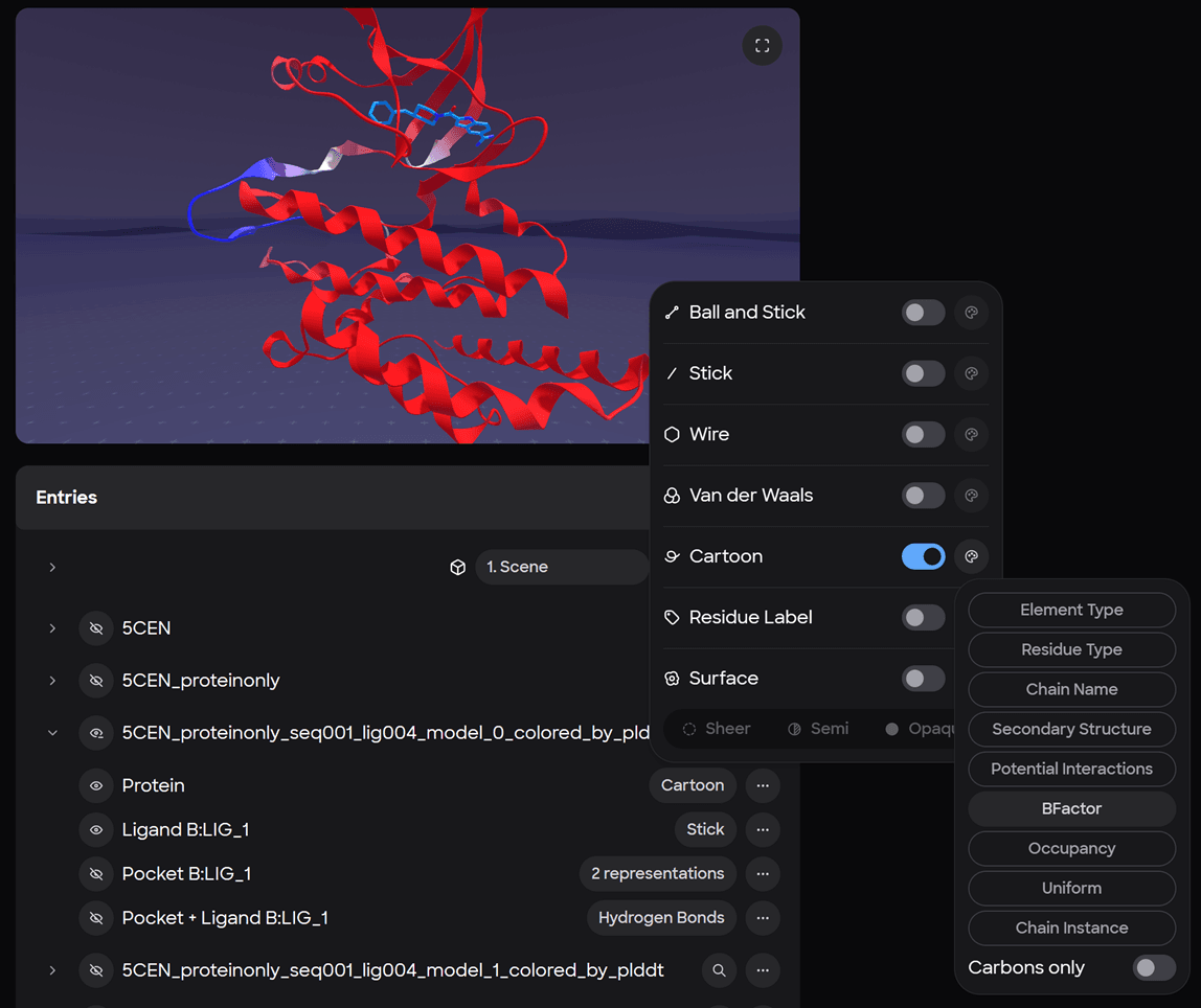 This forces a new prediction for each docking run by providing only the sequence and a ligand SMILES string. Researchers can then compare Boltz’s predicted protein fold against the known crystal structure to see how the software handles the docking across various iterations. An alignment within Nanome provides an RMSD value when comparing the folds from Boltz to the crystal structure.