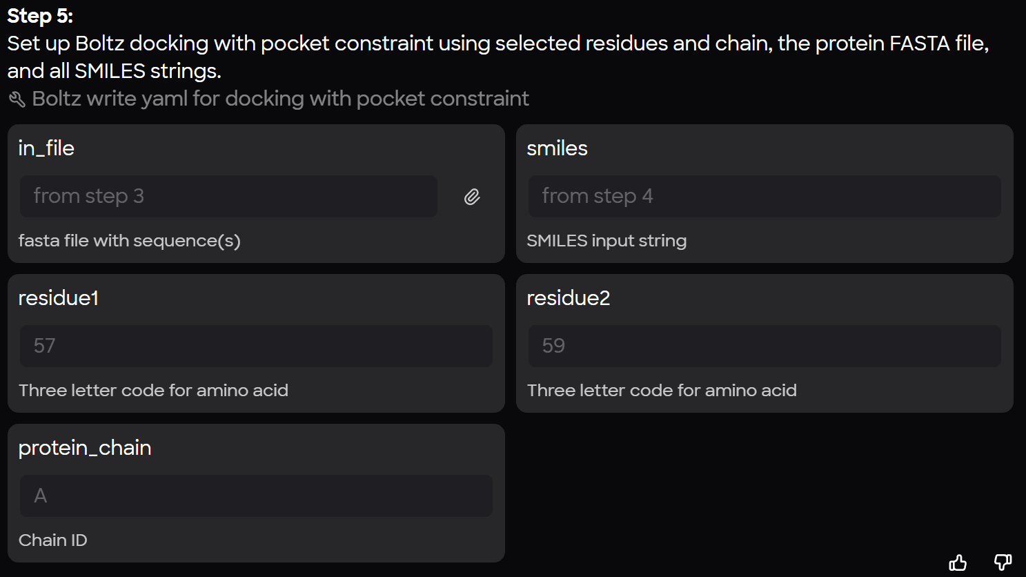 While Boltz can be forced to employ a structural template and build off of existing coordinates, -template tag can be used with a path to a structural file, this workflow intentionally omits the protein PDB from the final Boltz input.